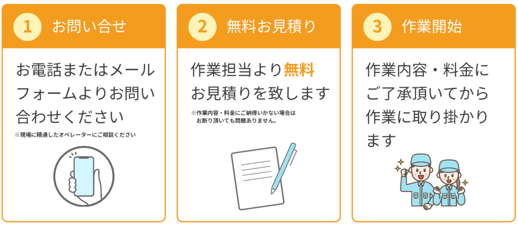 ※見積もりは原則無料です。万が一料金が発生する場合も事前にご説明しご納得いただいてからお伺いいたします。