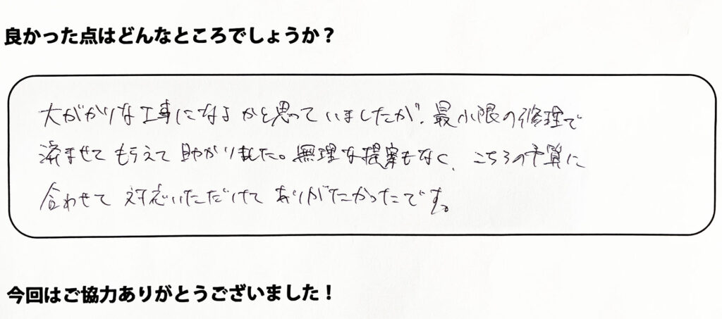 大がかりな工事になるかと思っていたのですが、最小限の修理で済ませてもらえて助かりました。無理な提案もなく、こちらの予算に合わせて対応いただけてありがたかったです。